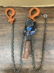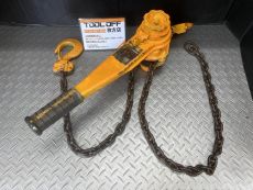 レバーブロックは、先端にフックの付いたチェーンで荷物をくくり、レバーを手で回すことでチェーンを締め上げ荷物を吊り上げたり締め付けたりすることができる工具です。
