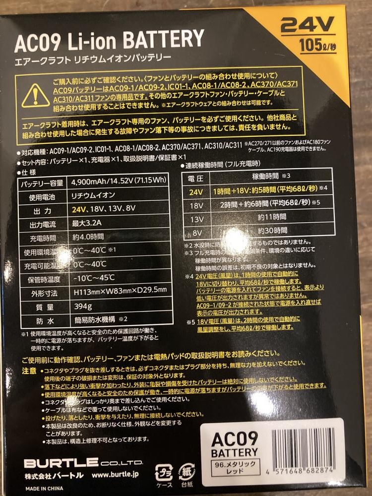 バートル BURTLE/空調服用ファンバッテリーセット/AC09+AC09-1